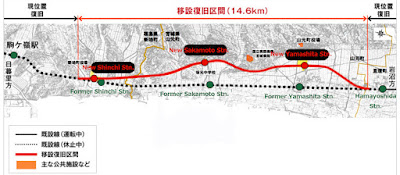 The work of reopening involved changing the route of the line and relocating the stations. Shinchi Station is now 20 meters south of its original location; Sakamoto Station and Yamashita Station, the next stations north, are about 1 km further inland from their original locations; Hamayoshida Station, next north, remains in its original location, which is where the renewed section of the Joban Line joins the original.